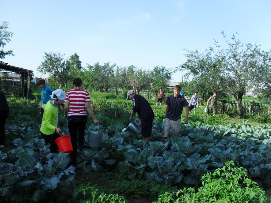 Организация трудовой деятельности учащихся в нашей школе тоже пропагандирует здоровое питание. Каждый год учащиеся школы работают на пришкольном участке, площадью 3 га. В соответствии с возрастными данными: 1 класс-5 дней, 2 класс- 6 дней и т.д.. Дети достигшие 14- летнего возраста могут устроиться на работу, через Центр занятости населения и в течении всего лета получать заработную плату. Ребята активно работают на пришкольном участке, выращивают рассаду, распахивают поле, поливают, рыхлят, занимаются прополкой, убирают урожай. Продукция реализуется населению. Школьники видят, как активно жители села приобретают продукцию, выращенную на органических удобрениях руками детей.